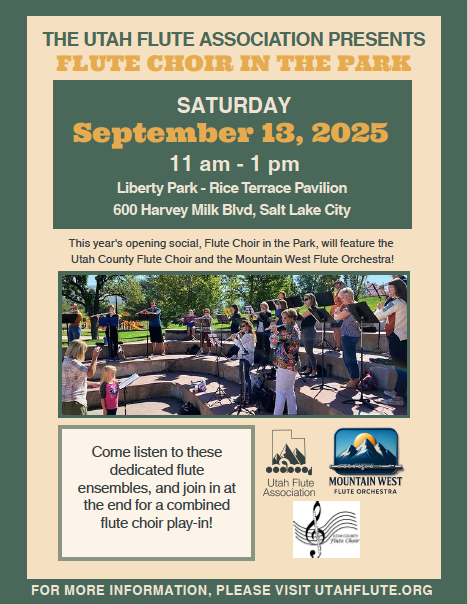 For our fifth annual season kick-off, Flute Choir in the Park, will feature the Utah County Flute Choir and the Mountain West Flute Orchestra! Come listen to these dedicated flute ensembles, and join in at the end for a combined flute choir play-in!